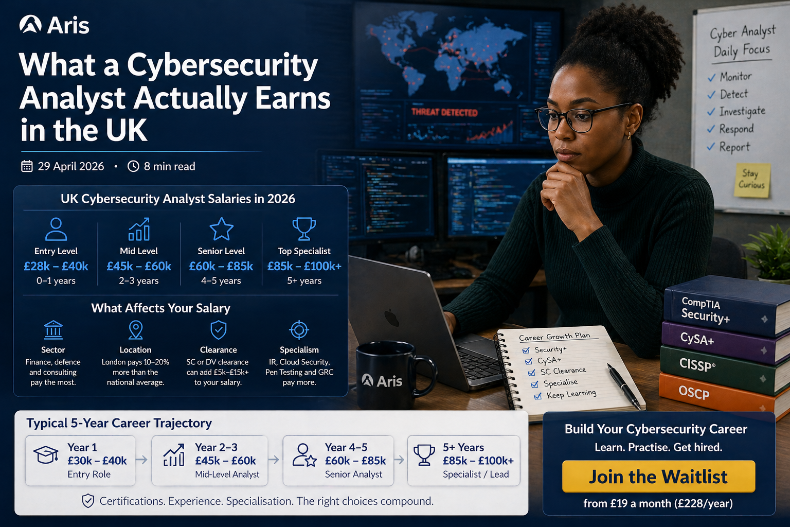 The headline UK cyber security analyst salary is fine. The real money sits in the trajectory and in the choices you make about specialism, sector, region, and clearance. The career changers who do best aren't necessarily the ones with the most certs. They're the ones who picked a specialism early, got into a real team, kept stacking the right credentials, and learned to talk about cyber the way a hiring manager wants to hear it talked about.